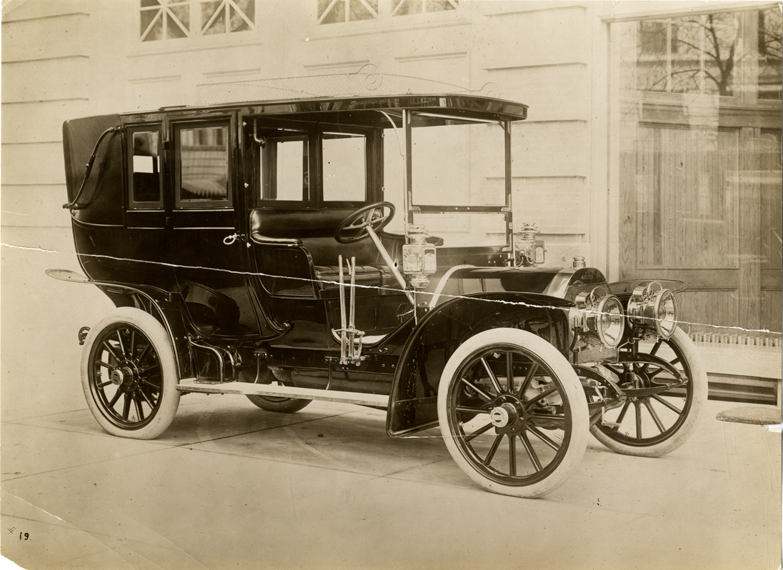 View of a 1908 American Berliet car. Stamped on back: "N. Lazarnick, photographic illustrations, 230 Park Avenue, New York Central Building, New York, N.Y. Tel. Vanderbilt 0011-12-13-14-15." Handwritten on back: "American Berliet, 1908. Also American Locomotive car."