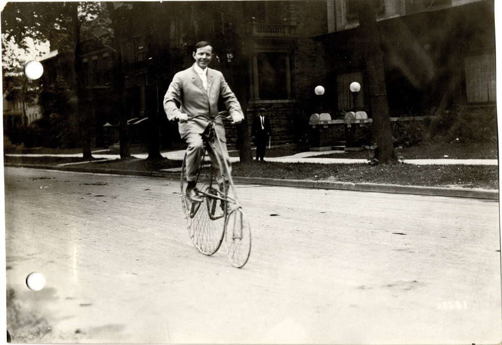 Mr. Lewis riding a bicycle, 1912 Cadillaqua