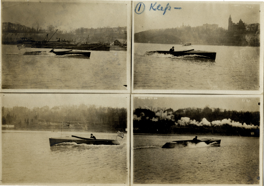 Four views of the motorboat "Vingt et Un I." Typed on back: "Photographs of the first Vingt et Un, for which the sensational speed of 26 miles per hour was claimed in November of 1903. Owners Smith & Mabley never entered the boast [sic] in a race, but widespread publicity of Vingt et Un's performance touched off an 'autoboat' craze that lasted for several years." Handwritten on back: "4 views of Vingt et Un, ca. 1903. Pioneer 'autoboat' campaigned by Smith & Mabley. Power was 4 cyl. Panhard. Boats and boating."