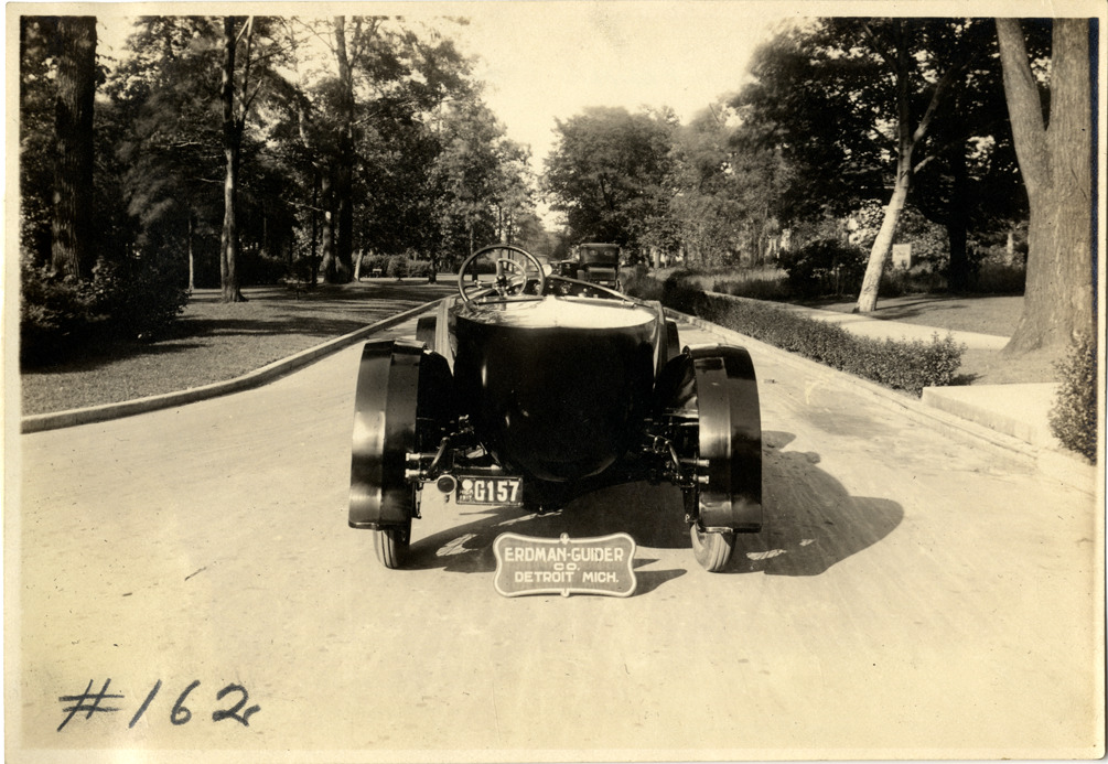 Rear view of a car with body designed by the Erdman-Guider Company. Sign reads: "Erdman-Guider Co., Detroit, Mich."