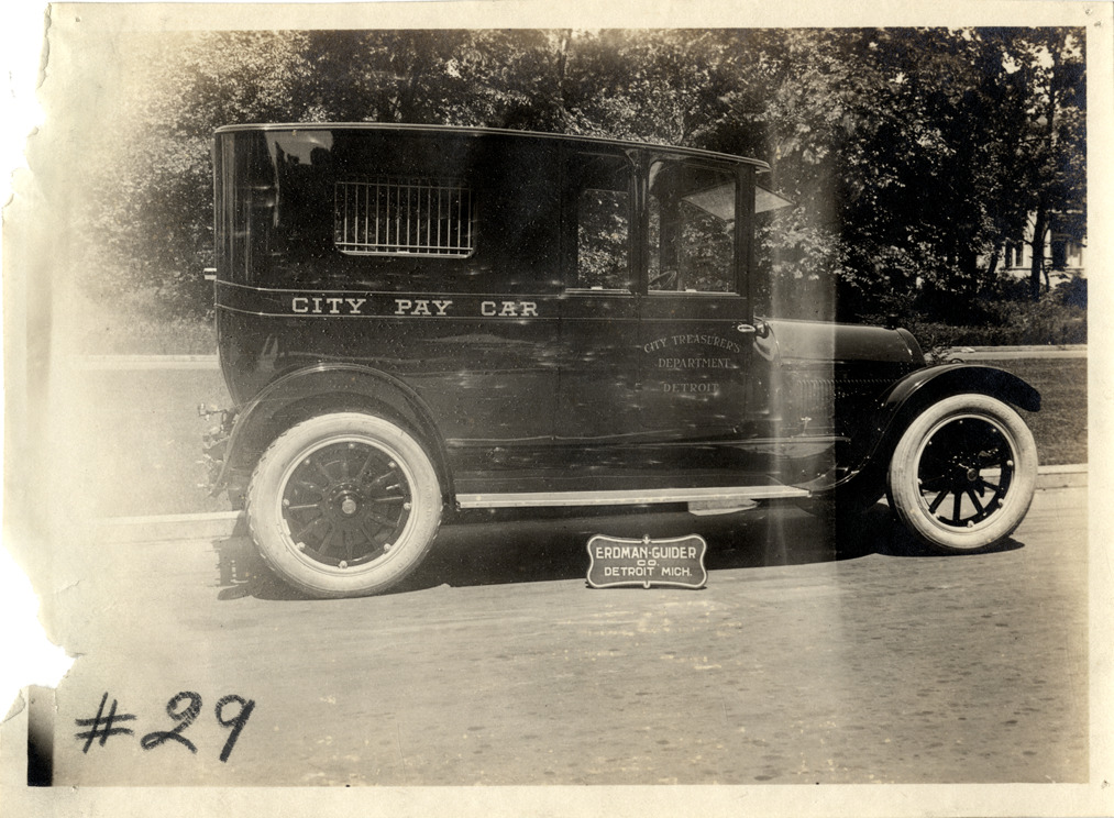 Favorite this☆ Automobile with Erdman-Guider body Description: View of a car with body designed by the Erdman-Guider Company. "City Pay Car" and "City Treasurer's Department, Detroit" is painted on side of car. Sign reads: "Erdman-Guider Co., Detroit, Mich." Details Resource ID: na041979 Subject: Automobiles--Bodies Automobiles Erdman-Guider Company Photographic prints Date Issued: Unknown year Format: 1 photographic print ; 5 x 6.75 in. Member of: National Automotive History Collection Filing Location: Bodies--Erdman-Guider Rights: Physical rights are retained by DPL. Copyright is retained in accordance with U.S. copyright laws.