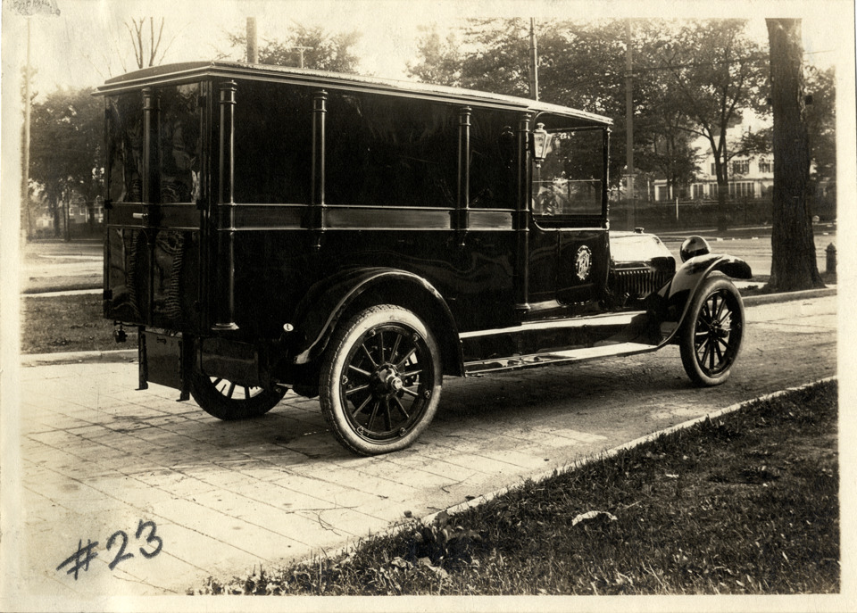 View of a hearse with body designed by the Erdman-Guider Company. "F&W" emblem is on vehicle door.