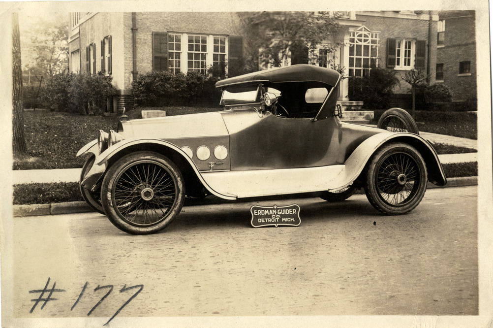 View of a car with body designed by the Erdman-Guider Company. Sign reads: "Erdman-Guider Co., Detroit, Mich." Houses in background.