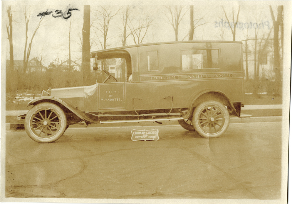 Favorite this☆ Ambulance with Erdman-Guider body Description: View of an ambulance with body designed by the Erdman-Guider Company. "City of Wyandotte police ambulance" is painted on side of vehicle. Sign reads: "Erdman-Guider Co., Detroit, Mich." Details Resource ID: na042021 Subject: Automobiles--Bodies Ambulances Erdman-Guider Company Photographic prints Date Issued: Unknown year Format: 1 photographic print ; 4.75 x 6.5 in. Member of: National Automotive History Collection Filing Location: Bodies--Erdman-Guider Rights: Physical rights are retained by DPL. Copyright is retained in accordance with U.S. copyright laws.