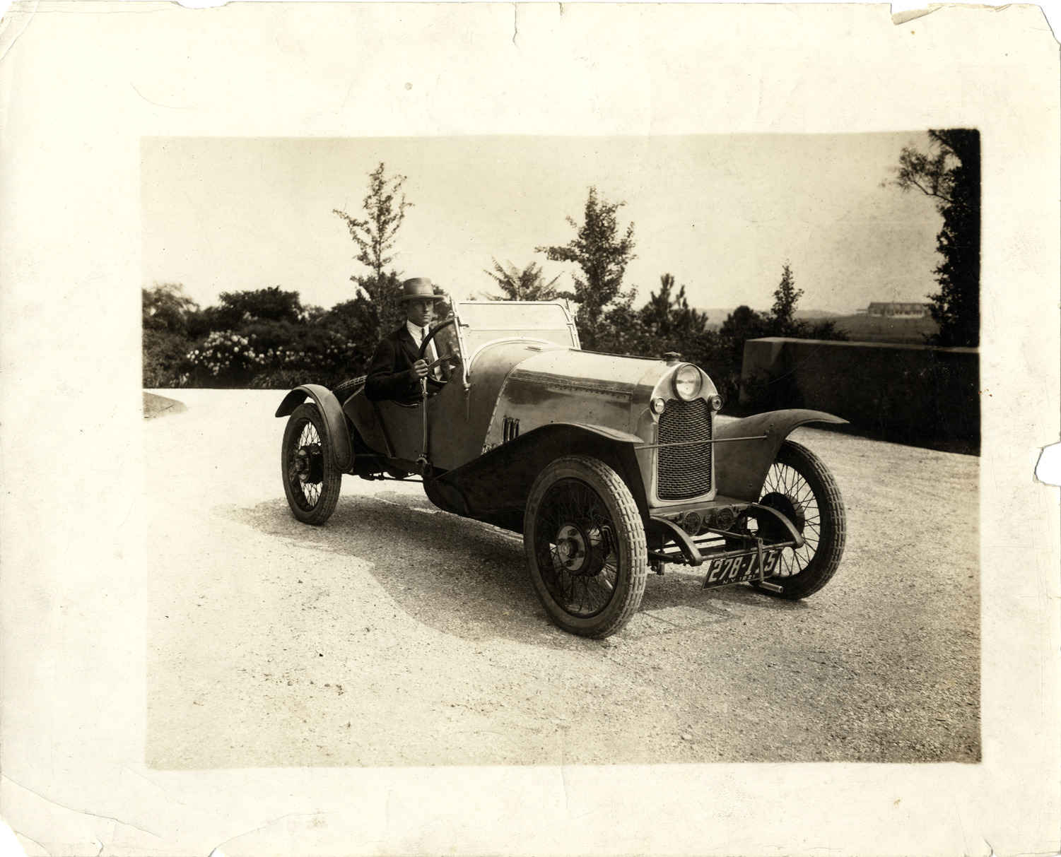 View of a driver posing in a Breese-Paris car. Handwritten on back: "Breese-Paris sport roadster. See Bulb Horn, Mar/Ap 64, p.4."