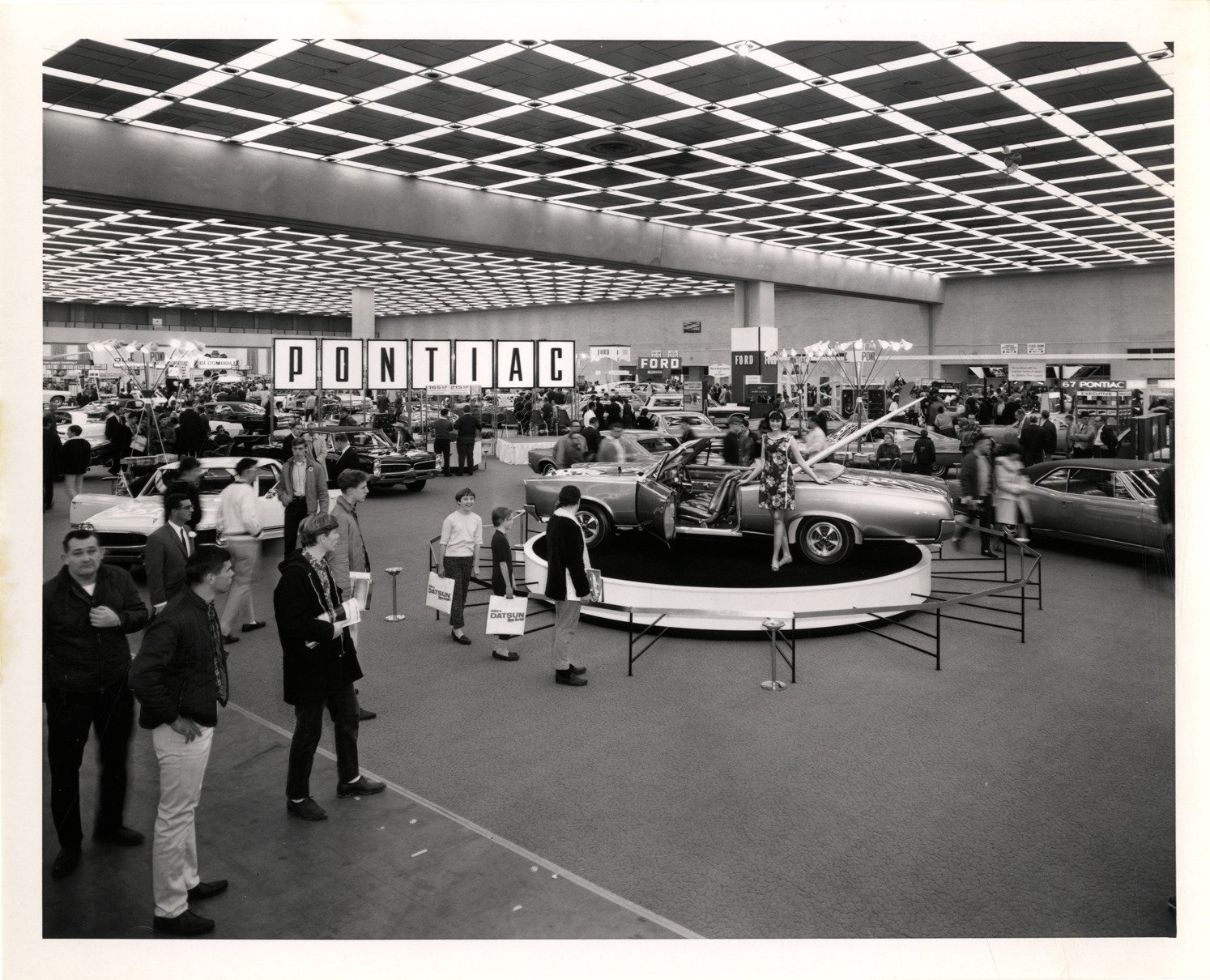 View of a woman posing with a Pontiac GTO coupe on circular platform at the 1967 Detroit Auto Show. Visitors in foreground; Pontiac sign in background. Typed on back: "51st Annual Auto Show, Nov. 26-Dec. 4, 1966."
