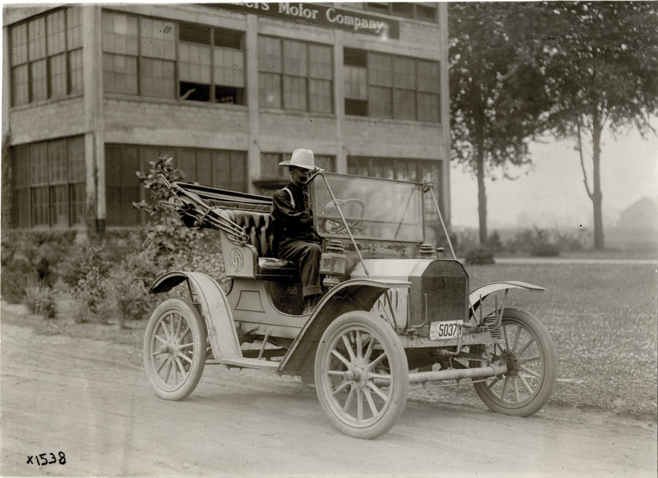 View of a man driving a Brush car. Chalmers Motor Company factory in background. Handwritten on back: "Brush, ca. 1909."