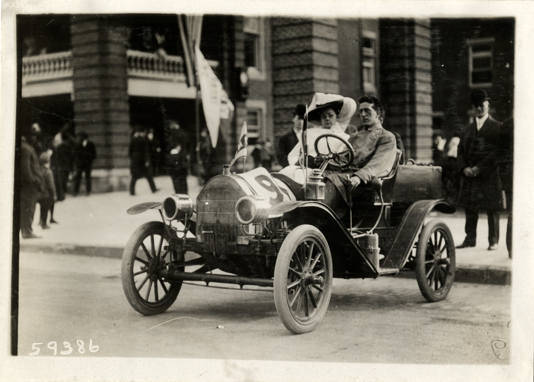 View of a man and woman in Brush car no. 9[?]. Stamped on back: "Spooner & Wells, Inc., photographers, telephones 3472-3473 Columbus, 1931 Broadway, New York." Handwritten on back: "Brush, ca. 1910."