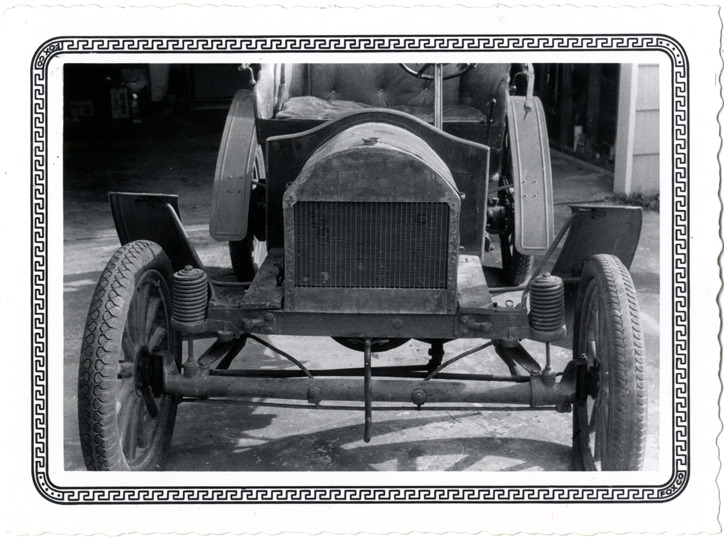 Close-up view of the front end of a 1912 Liberty-Brush car. Typed on back: "Liberty-Brush 1912." Stamped on back: "Fox Hill Focus. Fox Photo. Houston, Texas, August 1957."