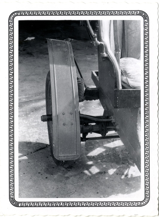 Close-up view of the rear wheel of a 1912 Liberty-Brush car. Typed on back: "Liberty-Brush 1912." Stamped on back: "Fox Hill Focus. Fox Photo. Houston, Texas, August 1957."