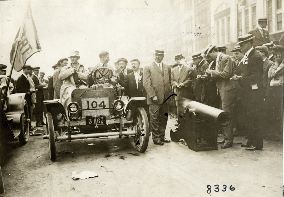 View of motorists in Brush car no. 104 alongside Mayor Philip Breitmeyer, officials and starter's cannon at start of the 1909 Glidden Tour, Detroit, Michigan. Onlookers in background. Stamped on back: "Photo by N. Lazarnick, 29 West 42nd Street, N.Y., tel. 594 Bryant." Handwritten on back: "Brush, Glidden, 1909."