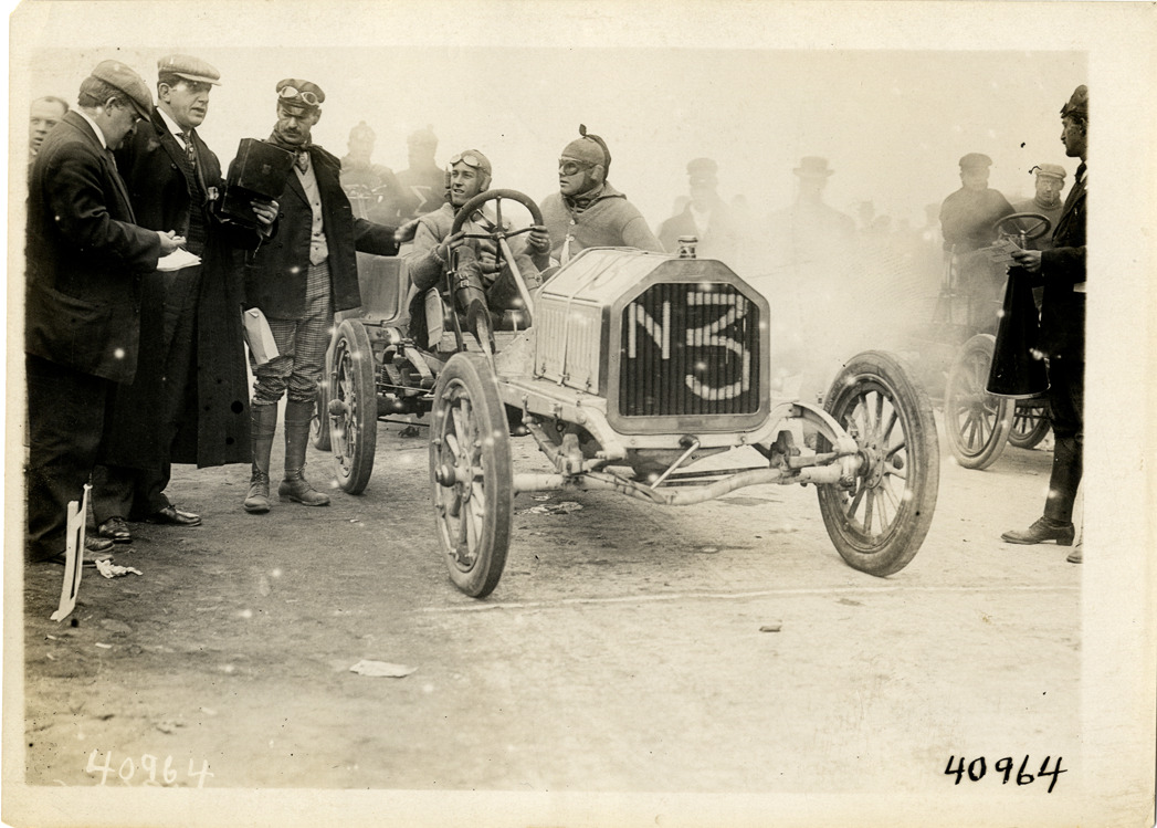 View of Fred Wagner standing next to driver Hugh Easter and passenger in Buick car no. N3 during the 1908 Long Island Sweepstakes in New York. Other racing officials stand nearby; announcer with megaphone on right. Stamped on back: "Spooner & Wells, Inc., photographers, telephones 3472-3473 Columbus, 1931 Broadway, New York." Handwritten on back: "Start of Easter. Nassau sweepstakes, Buick, 1908."