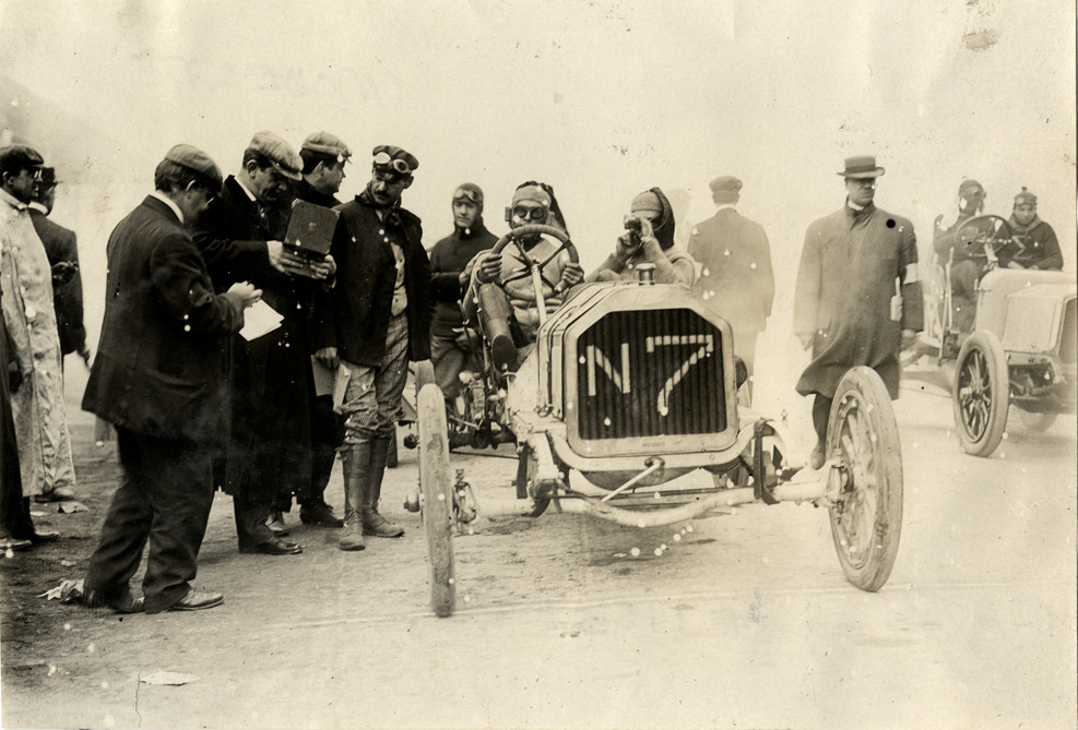 Driver and passenger in Buick Model D racecar, 1908 Long Island Sweepstakes