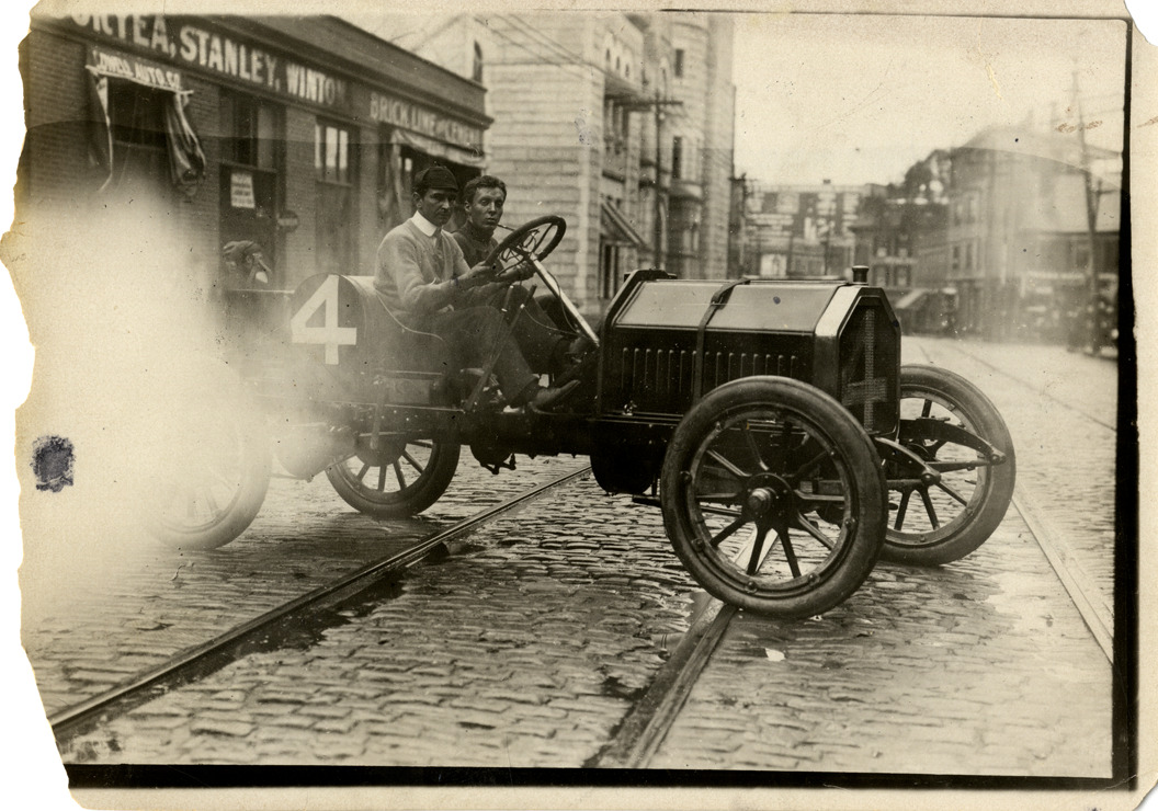 Favorite this☆ Bob Burman and passenger posing in Buick Model D racecar Description: View of Bob Burman and passenger in Buick Model D car no. 4 on brick street. Commercial buildings in background. Handwritten on back: "Burman, Buick, 1908. Model D." Details Resource ID: na042165 Subject: Automobiles, Racing Buick automobile Photographic prints Date Issued: 1908 Format: 1 photographic print ; 5 x 7 in. Member of: National Automotive History Collection Filing Location: Buick, 1908 Rights: Physical rights are retained by DPL. Copyright is retained in accordance with U.S. copyright laws.