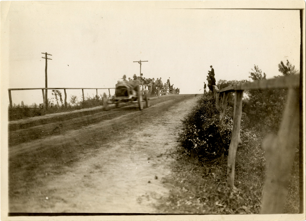 View of L.H. Titus racing Buick Model D car no. N7 on course during the 1908 Motor Parkway Sweepstakes on Long Island, New York. Spectators on roadside. Stamped on back: "Photo by N. Lazarnick, 29 West 42nd Street, N.Y., tel. 594 Bryant." Handwritten on back: "Titus, Buick. Motor Parkway, 1908. Buick Model D, 1908."