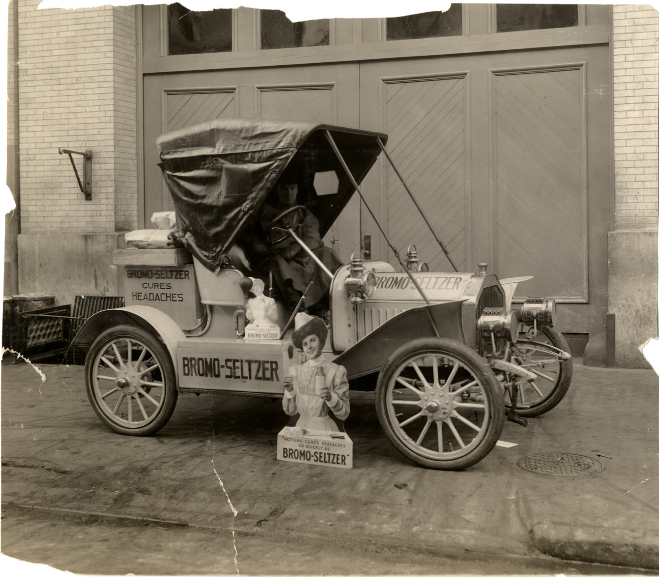 View of a motorist posing in a Buick Model 10 car, which advertises Bromo-Seltzer. Cutouts of a woman holding a bottle of Bromo-Seltzer are displayed in front of car, with text reading: "Nothing cures headaches so quickly as Bromo-Seltzer." "Bromo-Seltzer cures headaches" and "Bromo-Seltzer" is painted on car. Handwritten on back: "Buick, ca. 1908-9. Model 10."