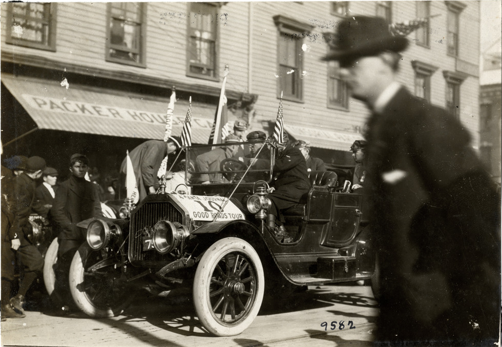 View of driver and passengers in 1909 Buick Model 17 car at Perth Amboy, New Jersey during the 1909 New York to Atlanta Good Roads tour. Sign on hood of car: "10, Atlanta Journal Good Roads Tour." Packer House Café in background. Stamped on back: "Photo by N. Lazarnick. 244-6-8 W. 42nd Street, N.Y. Tel. 594 Bryant. In ordering duplicates mention number on back of this print." Handwritten on back: "Buick, 1909. Model 17."