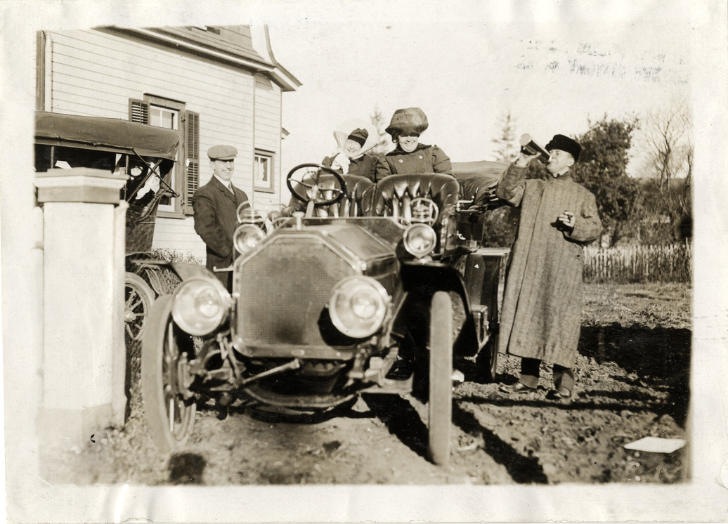 View of motorists posing with a 1909 Buick Model 10 car. Man drinks from thermos on right; wooden-frame house in background. Stamped on back: "Photo by Spooner & Wells, Inc. 1931 Broadway, N.Y." Handwritten on back: "Buick, 1909. Model 10."