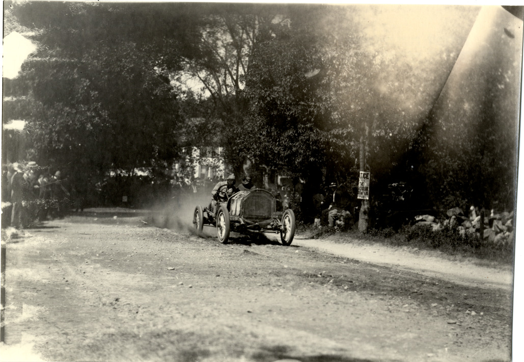 Driver and passenger in 1909 Buick Model D racecar, 1909 Lowell road race