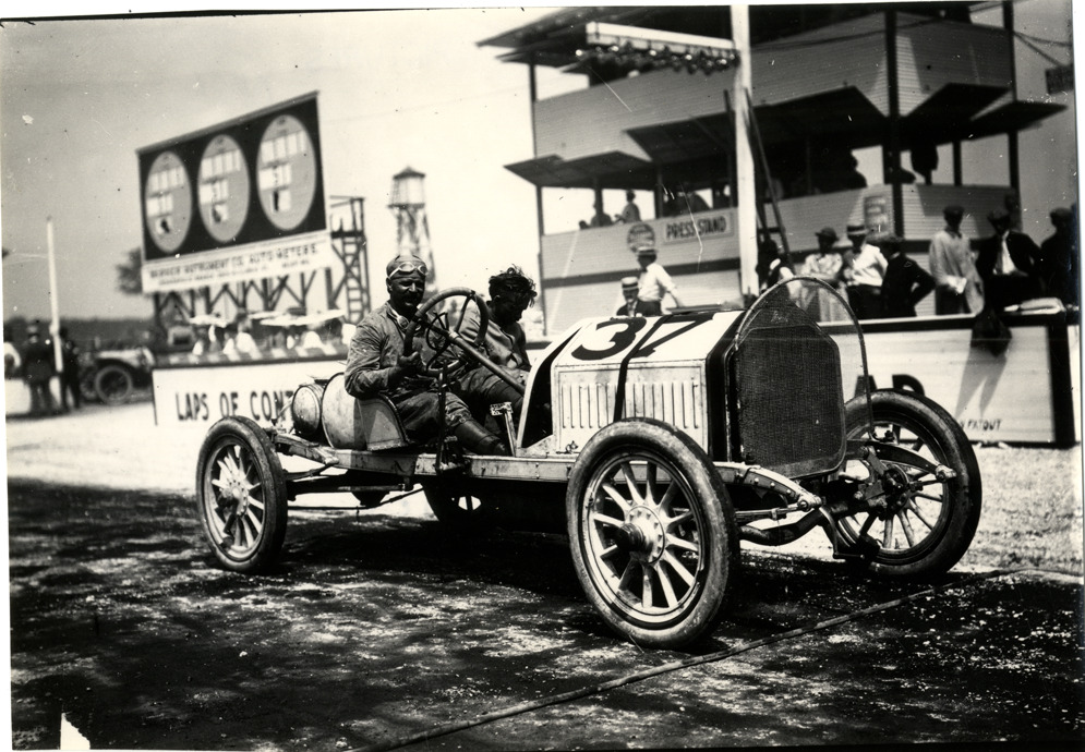 Louis Chevrolet and passenger in 1909 Buick Model D racecar, 1909 Indianapolis races