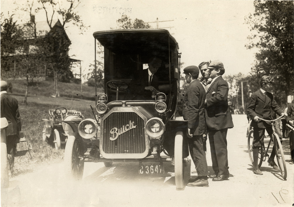 Men speaking with motorist in a 1909 Buick Model 19 automobile