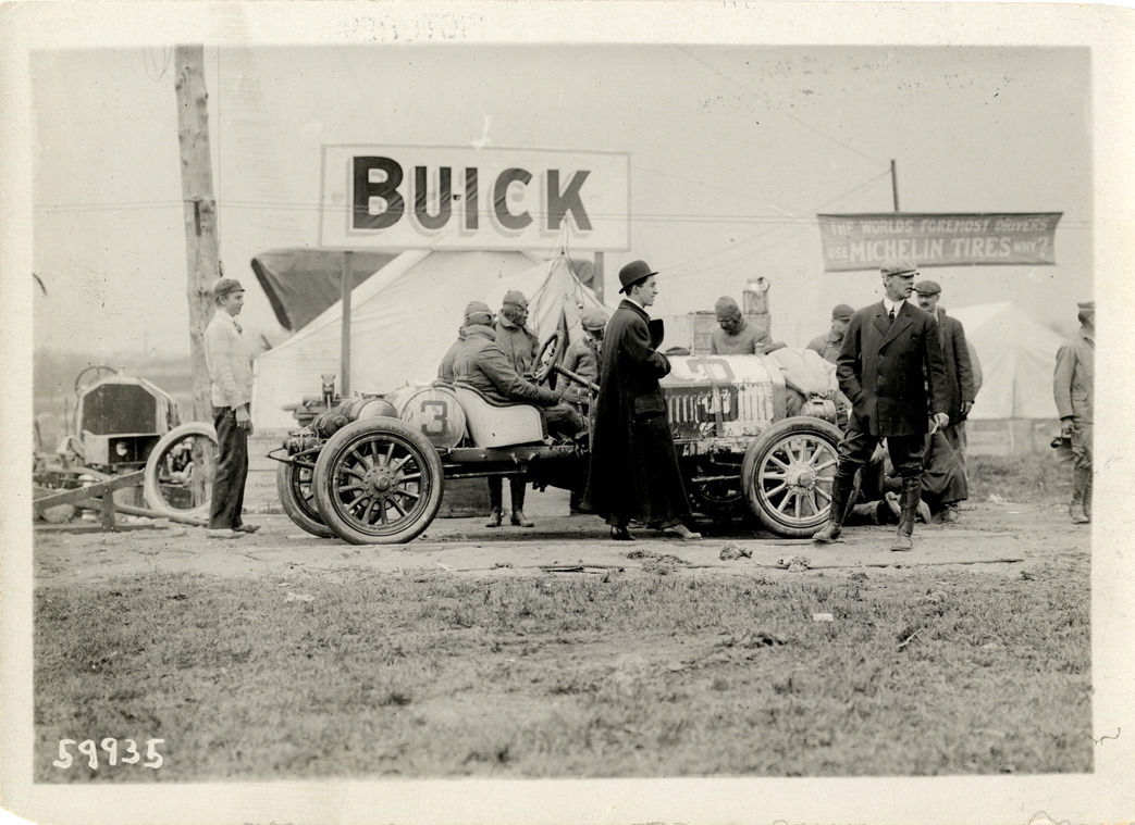 View of Louis and Arthur Chevrolet in 1910 Buick Model 21 car no. 3 during 1910 Brighton Beach races in New York. Officials in foreground; tent with "Buick" sign in background. Sign on right reads: "The world's foremost drivers use Michelin tires, why?" Stamped on back: "Spooner & Wells, Inc., photographers, telephones 3472-3473 Columbus, 1931 Broadway, New York." Handwritten on back: "Louis & Art Chevrolet, Buick, Brighton Beach, 1910. Buick, 1910. Model 21 racer."