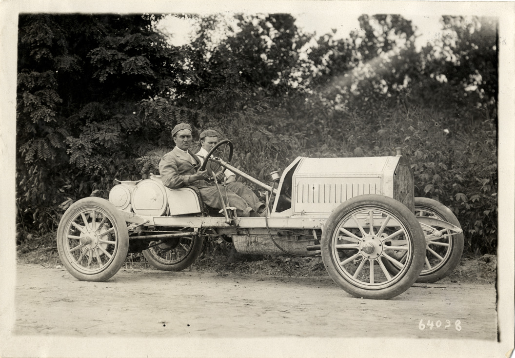 Driver and passenger posing in Buick Model 16 racecar