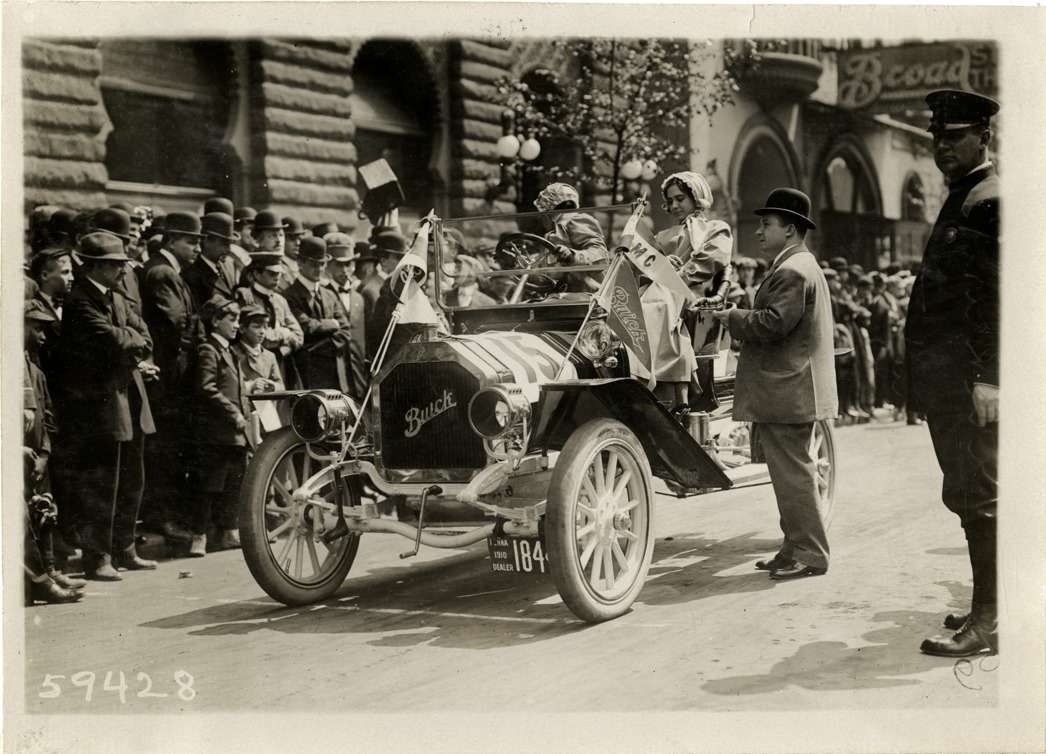 View of Mr. Wilkins and his daughters, with Buick Model 10 car no. 15. Spectators stand on sidewalk; policeman on right. Stamped on back: "Spooner & Wells, Inc., photographers, telephones 3472-3473 Columbus, 1931 Broadway, New York." Handwritten on back: "Buick, ca. 1910. Model 10. Mr. Wilkins, his daughters in Buick #15."