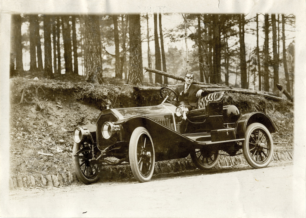 View of a motorist posing in 1910 Buick Model 14 car on roadside. Stamped on back: "Spooner & Wells, Inc., photographers, telephones 3472-3473 Columbus, 1931 Broadway, New York." Handwritten on back: "Buick, 1910, Model 14."