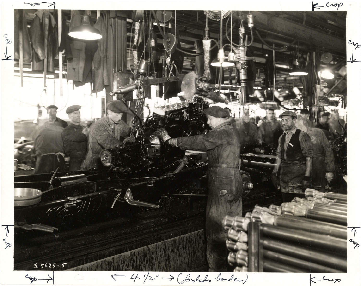View of Tony Memino and Del Martin installing a Chrysler Imperial engine at the Chrysler plant. Label on back: "Putting the 'heart' in a Chrysler. Near the beginning of the chassis assembly line, the Chrysler engine is installed on its floating power rubber mountings. Engines are carried almost a quarter of a mile on an overload conveyor to be picked off by the assembly line crew when needed. Tony Memino and Del Martin, who comprise this crew, work so expertly that it takes them less than a minute to install this big 110-horsepower Chrysler Imperial engine." Handwritten on back: "Chrysler, 1937."
