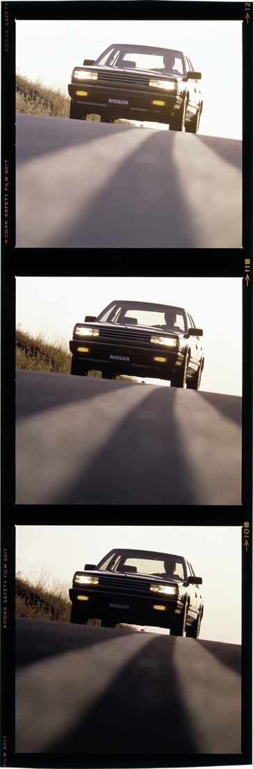 Three views of a man driving a Nissan Maxima sedan. Label on sleeve: "Nissan, Nissan Maxima."