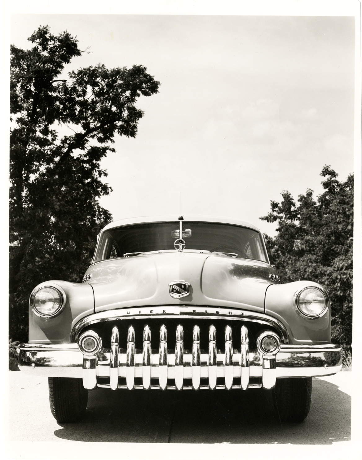 Front view of a 1950 Buick Special Eight car. Label on back: "High on the list of engineering achievements on the new Buick Special is the design of the combined bumper and grille. Developed by Buick and offered on the Special for the first time, this innovation was accomplished by placing the vertical bumper grille bars forward of the single-piece bumper. Two bomb-shaped bumper guards, which also house the parking lamps, are mounted on the bumper." Stamped on back: "General Motors Photographic Section, G.M. Research Bldg., Detroit 2, Michigan. Please refer to this number when ordering prints."