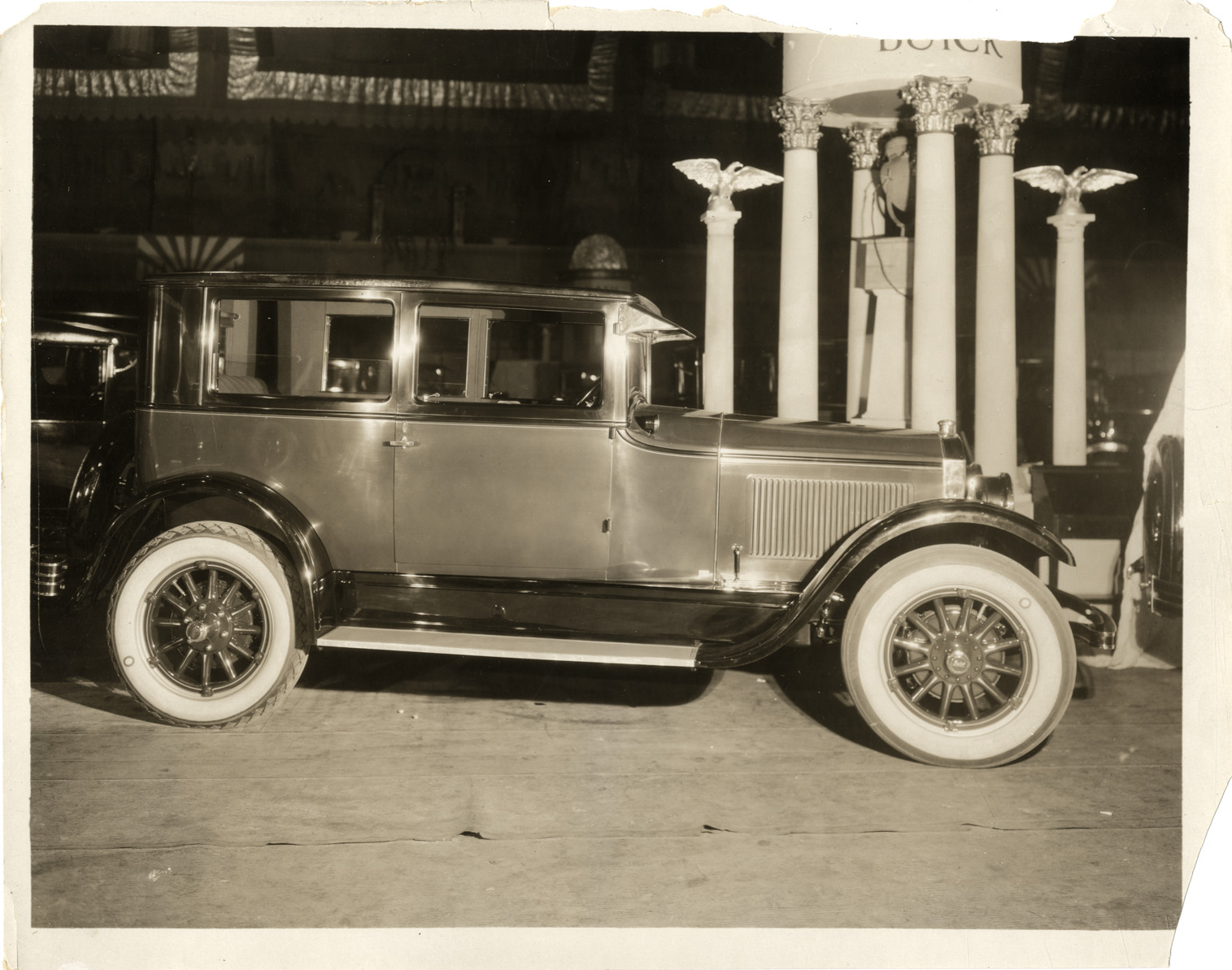 View of a Buick Model 6-40 automobile on display at trade show. Stamped on back: "N. Lazarnick, commercial photographers, makers of industrial motion pictures, 246 W. 42d St., N.Y., Tel. Chickering 1717-18. 5005 Euclid Ave., Cleve., Randolph 7852." Handwritten on back: "Buick, app. 1925. Model master 6-40."