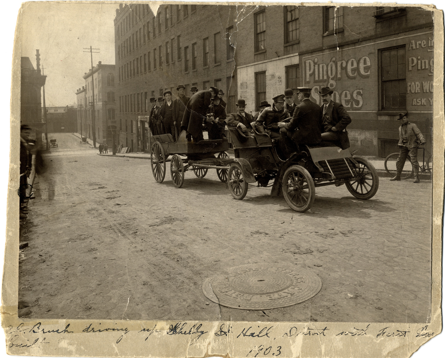 View of Alanson P. Brush and motorists in a 1903 Cadillac Model A car, pulling passengers in a wagon on Shelby St. Commercial buildings and man with bicycle in background. Handwritten on front: "Al Brush driving up Shelby St. hill, Detroit with first [undeciperable] built 1903." Handwritten on back: "1903 Cadillac, Model A. 1 cy., 10 h.p., 70" whb. 4-p. touring with detachable rear-entrance tonneau. $850 f.o.b. A notation on the border of this photograph reads: 'Al Brush driving up Shelby St. hill, Detroit with first [Cadillac] built 1903.' It is doubtful that this is the very first Cadillac (various details are different when compared to #1), although certainly this is an early Model A. A slightly retouched version of this photograph was used in Cadillac's advertising; a full-page advertisement in the 30 January 1904 issue of Scientific American (page 91) used this photograph. ZB Conley, Jr. 8-19-1981."