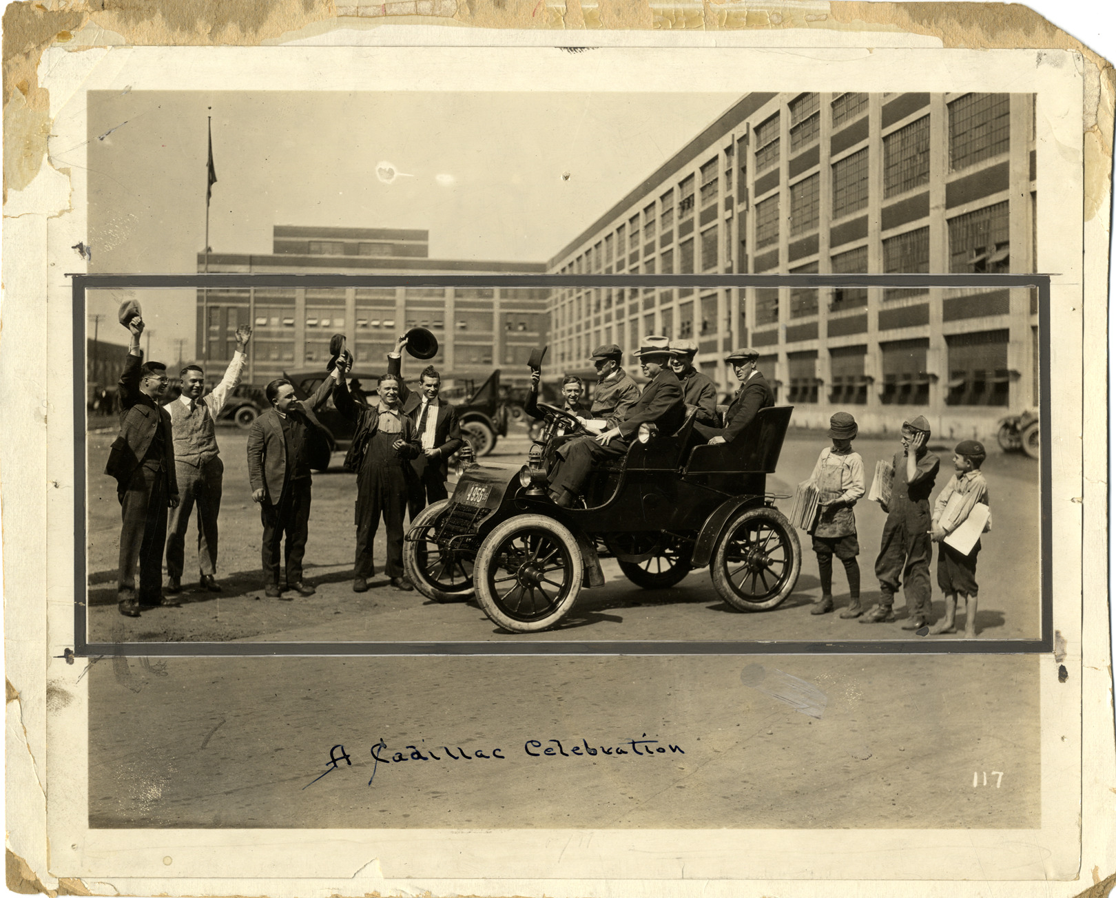 View of motorists posing in a 1903 Cadillac Model A car. Group of men on left wave their hats overhead; three newsboys stand on right. Factory building in background. Handwritten on front: "A Cadillac celebration." Label on back: "A Cadillac celebration in 1922." Handwritten on back: "A Cadillac celebration. Taken in 1922. 1903 Cadillac shown."