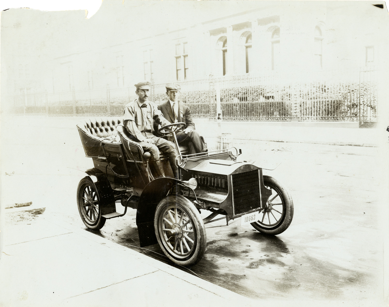 View of John C. Kerrison and passenger in 1905 Cadillac Model F car in New York, New York, during the 1905 Glidden Tour. Handwritten on back: 1905 Cadillac Model F ~ 4 cy, 76" whb, 10 hp. Touring car, $950 f.o.b. 5-p. side entrance tonneau. Original photograph: F. Ed. Spooner, 1536 Broadway, N.Y.C. Tour car #32. Second Annual Reliability Touring Contest of the American Automobile Association (1st of the Glidden Tours). New York to Bretton Woods & return. 11-22 July 1905 ~ 870 miles. Entrant: John C. Kerrison, Boston, Mass. Passengers of record: Mrs. Kerrison & daughter. Note: This is the same car & passengers, different view, as in the photograph marked 6433 or 7, also in the National Automotive History Coll. 10663 licence [sic] plate. Photographed on Fifth Avenue & 58th St., NYC. Cornelius Vanderbilt residence in background prior to the start of the tour."