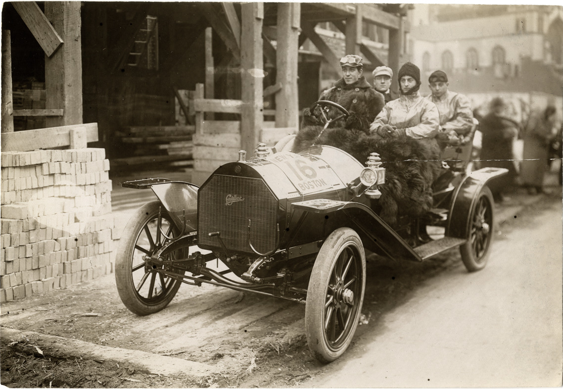 View of motorists posing in Cadillac car no. 16 during the 1909 New York to Boston Endurance Run. Stamped on back: "Photo by N. Lazarnick, 29 West 42nd Street, N.Y., tel. 594 Bryant." Handwritten on back: "1909 New York to Boston Endurance Run."