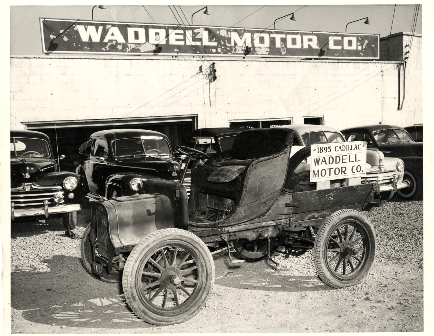 View of a 1906-1907 Cadillac Model K car on display at the Waddell Motor Co. 1947 Ford cars in background. "Waddell Motor Co." sign on building; sign on right reads: "1895 [sic] Cadillac, Waddell Motor Co." Handwritten on back: "1906-7 Cadillac Model K, 1 cy., 10 h.p., 76" whb. Originally equipped with a 4-p. victoria body. Note new 1947 Ford cars in background. Of course sign somewhat incorrect, in as much as the first Cadillac was not completed until 20 October 1902."