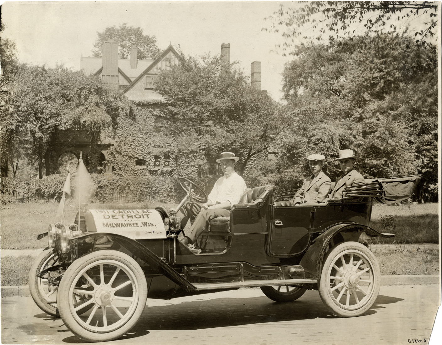 View of motorists posing in a 1911 Cadillac Model 30 car. "1911 Cadillac, Detroit to Milwaukee, Wis." sign is displayed on car. Ivy-covered house in background. Stamped on back: "Spooner & Wells, Inc., photographers, telephone North 1745. 1231 Woodward Ave., Detroit, Mich. Detroit, 1231 Woodward, New York, 1931 Broadway." Handwritten on back: "1911 Cadillac Model Thirty, 4 cy., 32-4 hp, 40 hp., 116" whb., 5-p. touring car, $1700 f.o.b. Photograph by Spooner & Wells. Driven from Detroit to Milwaukee by Mr. Janes of Jane Auto Co."