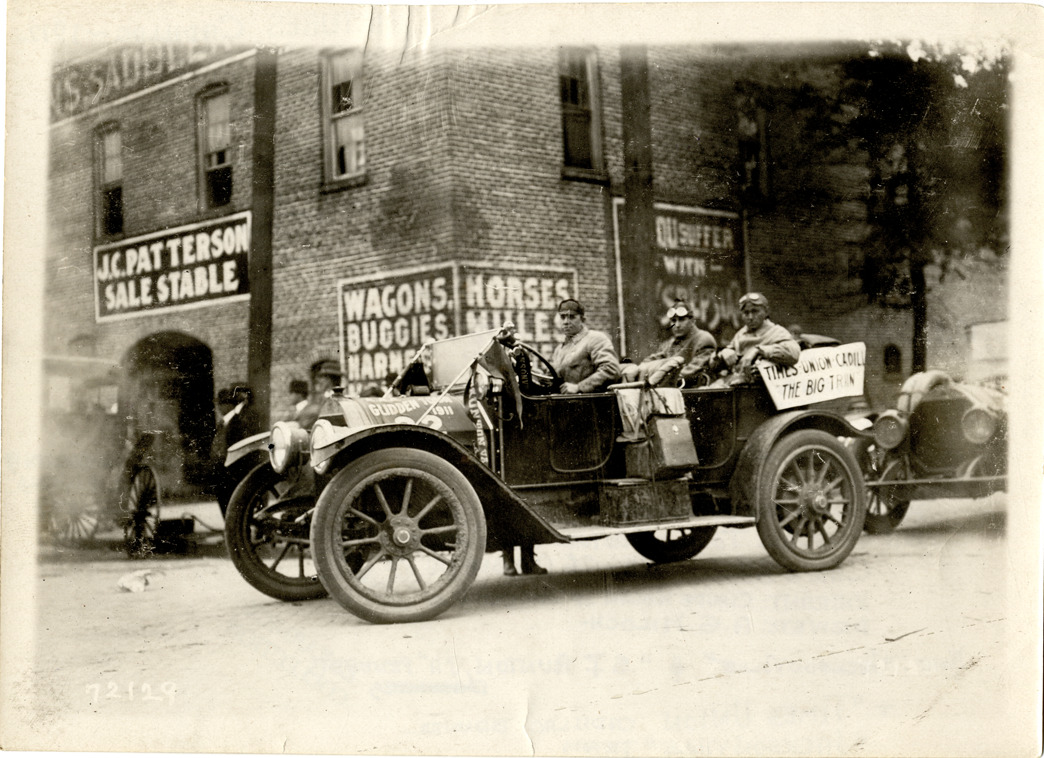 View of A.G. Miloch and motorists posing in 1912 Cadillac Model 30 car no. 32 during the 1911 Glidden Tour. J.C. Patterson sale stable in background. Stamped on back: "Spooner & Wells, Inc., photographers, telephones 3472-3473 Columbus, 1931 Broadway, New York." Handwritten on back: "1912 Cadillac Model Thirty, 4 cy., 40 hp., 116" whb, equipped with Delco system, 4-p. phaeton, $1865 f.o.b. with cape top. Photograph taken during 1911 Glidden Tour, New York-Jacksonville, 14-26 October 1911. Car #32. Entrant: Claude Nolan of Live Oak, Fla. Driver: A.G. Miloch. Note: Jacksonville & S.T. Aunton, Va. pennants + Times Union Cadillac banner, Jacksonville team. Original photograph by Spooner & Wells (F. Ed. Spooner). License plate: 40."