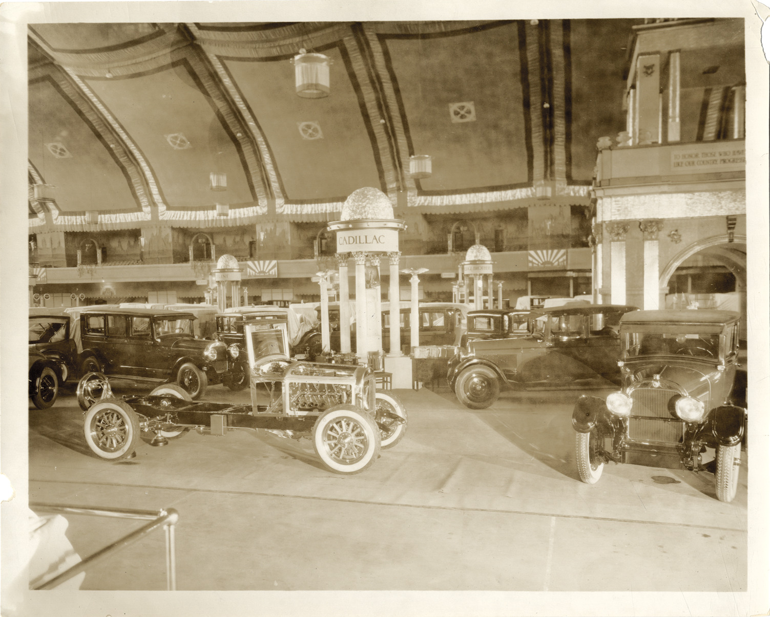 View of 1925 Cadillac V-63 cars and chassis on display at the 25th New York Automobile Show at the Bronx Armory. Handwritten on back: "1925 Cadillacs, Series V-63 exhibited on the Cadillac stand at the 25th (Silver Jubilee) New York Automobile Show. Opened to the trade: Friday morning, 2 January 1925, opened to the public: Saturday evening, 3 January 1925. Held at the Bronx Armory. Cars exhibited: Special working show chassis, 5-p. coach, 5-p. coupe, 7-p. Suburban, 2-p. coupe. Photographed by N. Lazarnick." Drawing of exhibit floor plan on back.