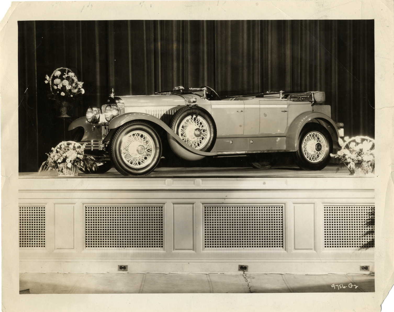 View of a 1926 Cadillac car onstage at the General Motors Fall Salon in Detroit, Michigan. Stage is decorated with baskets of flowers. Label on back: "The fleet and graceful Cadillac custom-built four-passenger sport phaeton shown above is drawing favorable comments at the General Motors Fall Salon held in the General Motors Building, Detroit. It is an adaptation of the custom phaeton with the addition of the double cowl and tonneau windshield. Windshield may be folded forward when the top is lowered. It has a cane wicker panel extending across the two doors, six wire wheels, with the extras set in front fender wells, and a top newly designed to fold compactly, carrying out the straight line of the lowered windshield." Handwritten on back: "Cadillac, 1926. Oct. 12, 1926."
