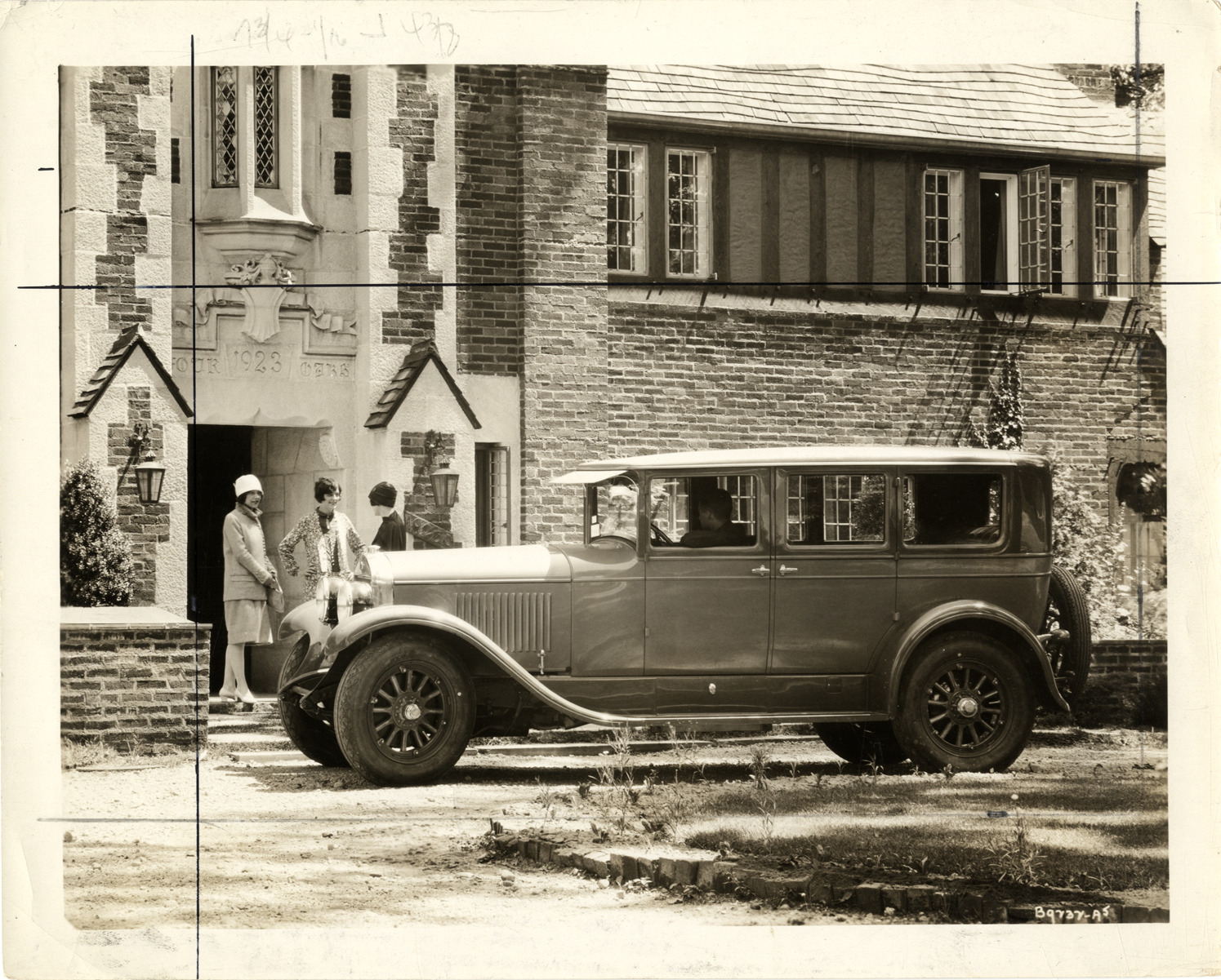 View of a driver in a 1927 Cadillac car. Three women stand in doorway of building; "1923 Four Oaks" is inscribed over door. Label on back: "Included in the fifty body types and styles in the Cadillac line for this fall is this impressive seven-passenger sedan. New fenders, headlamps and radiator casing add grace and strength to the appearance, and window recesses in colors give an added dash of liveliness to the upper panel."