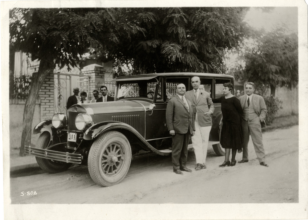 View of Mayor Patsis of Athens, Greece and Cadillac dealer Mr. Vusher posing with a 1928 Cadillac car. Label on back: "Mayor Patsis of Athens has chosen a custom Imperial Suburban Cadillac for his personal use. Mr. Vusher, Cadillac dealer in Athens, is standing at the left. Mayor Patsis is next to him, and on the Mayor's left are his sister and brother-in-law." Handwritten on back: "1928 Cadillac."