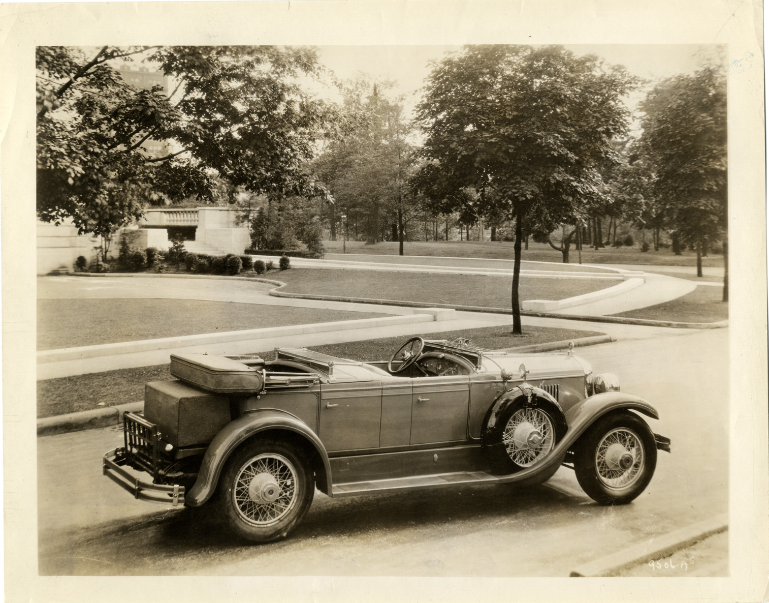View of a 1928 Cadillac car. Label on back: "The Cadillac four-passenger custom-built sport phaeton is an adaptation of the custom phaeton with the addition of the double cowl and tonneau windshield. Both windshields may be folded forward to carry out the fleet line of the compactly folded top. A cane wicker monogram panel extending across both doors, six wire wheels with extras set in front fender wells, cowl lamps of the same design as the head lamps and a folding rear trunk rack are features which add to the youthful lines of the car." Handwritten on back: "1928 Cadillac."