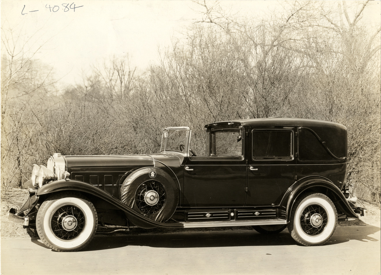 View of a 1930 Cadillac V-16 car. Label on back: "L-4084, 1930, Cadillac V-16." Stamped on back: "Studio of John Adams Davis. Printing Crafts Building, 461 Eighth Ave., New York. Medallion 5030-5031." Handwritten on back: "1930 model, town cabriolet, V-16 Cadillac."