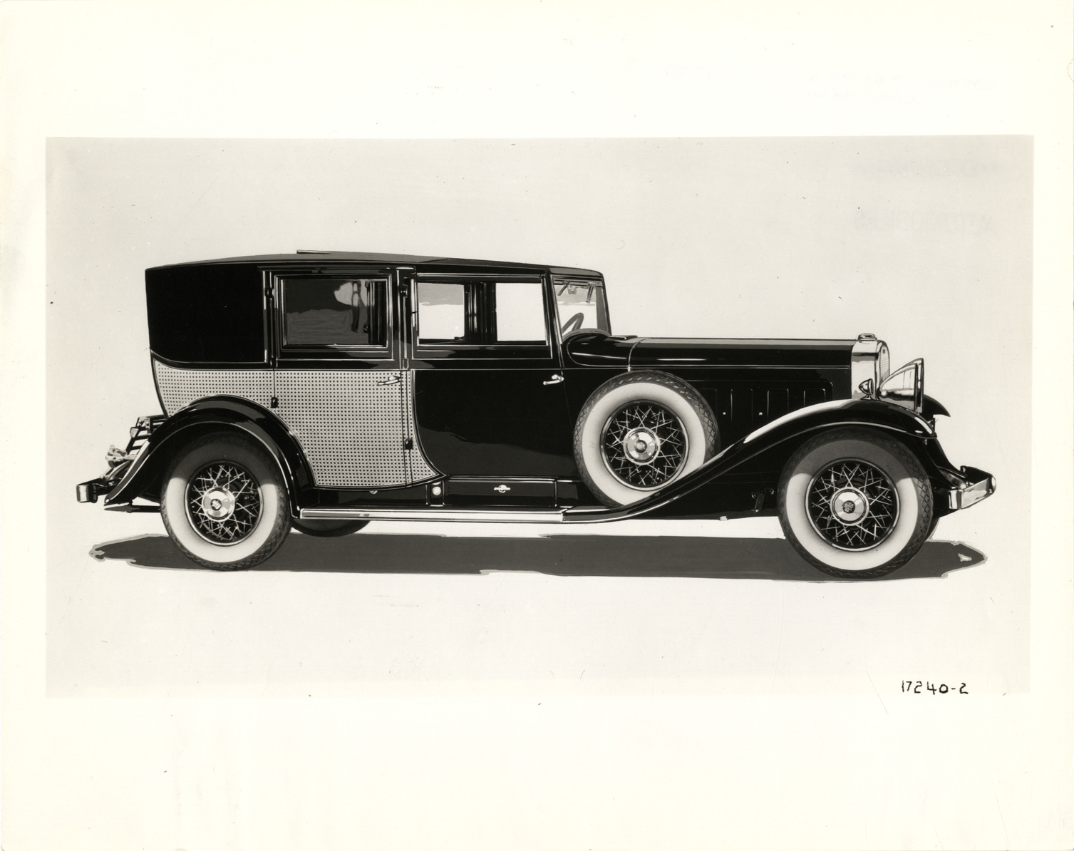 View of a 1930 Cadillac V-16 car. Label on back: "The new Cadillac V-16 with town brougham body by Fleetwood. Like the other bodies which will grace the chassis of this new 16-cylinder Cadillac, this is entirely custom built by one of the country's foremost coach builders. A very smart effect is achieved by the canework on lower panels, and the removable roof curtain over the chauffeur's seat."