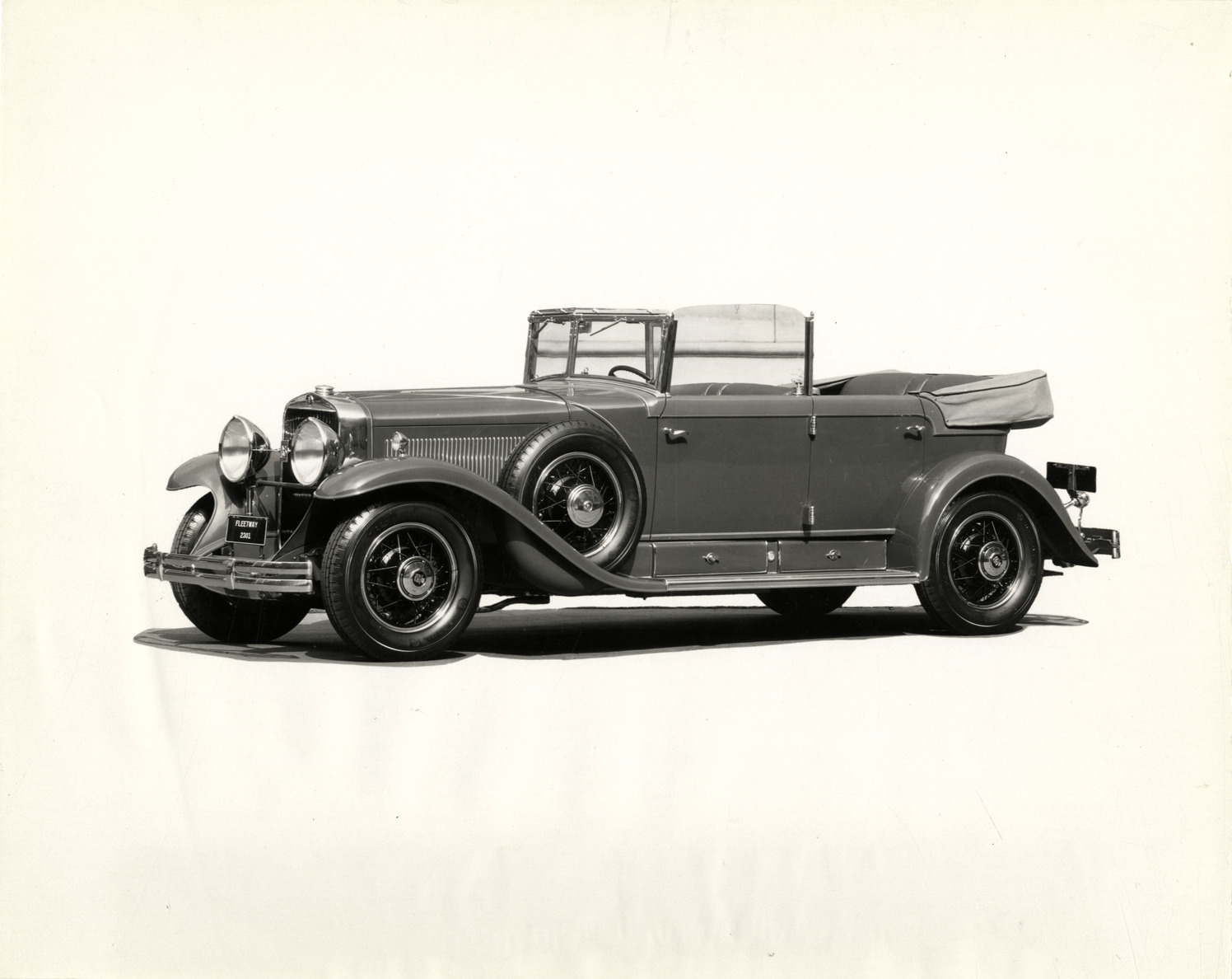 View of a 1930 Cadillac car. Label on back: "Here is the Cadillac-Fleetway all-weather phaeton with top down and division glass between compartments raised as a windshield. A moment's work converts the Fleetway into a fully enclosed car affording complete protection from the elements in any sort of weather." Handwritten on back: "1930 Cadillac."