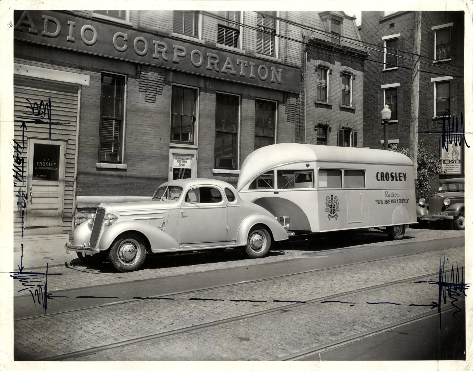 View of a car pulling a Crosley motorized salesroom Curtiss Aerocar trailer. "Crosley radios. You're there with a Crosley." The Crosley Distributing Corporation building in background. Label on back: "For immediate release. Motorized sales room used to sell Shelvadors. This motorized sales room is seen on the highways and in the streets in Ohio and Kentucky near Cincinnati daily. It is used by the Crosley Distributing Corporation of Cincinnati in cooperation with local Crosley dealers in the various cities and towns visited. Thus Crosley Shelvador electric refrigerators are brought to the very door of the prospect's home, and the housewife can step out and make her selection just as she would if she were to go to the dealer's store. Frank Pater is the special salesman who accompanies the trailer. With him goes the salesman for the local dealer, and together they call upon the dealer's prospects. This traveling salesroom has resulted in greatly increased sales of Crosley Shelvadors for the dealers using it. The equipment consists of a Chevrolet coupe and the Aerocar trailer. The lid in the back of the automobile is removed and the coupling mechanism includes an airplane wheel with full-inflated tire, thus cushioning out all jars in travel. James W. Beckman, Director of Public Relations, Crosley Radio Corporation." Handwritten on back: "Camping, '35."