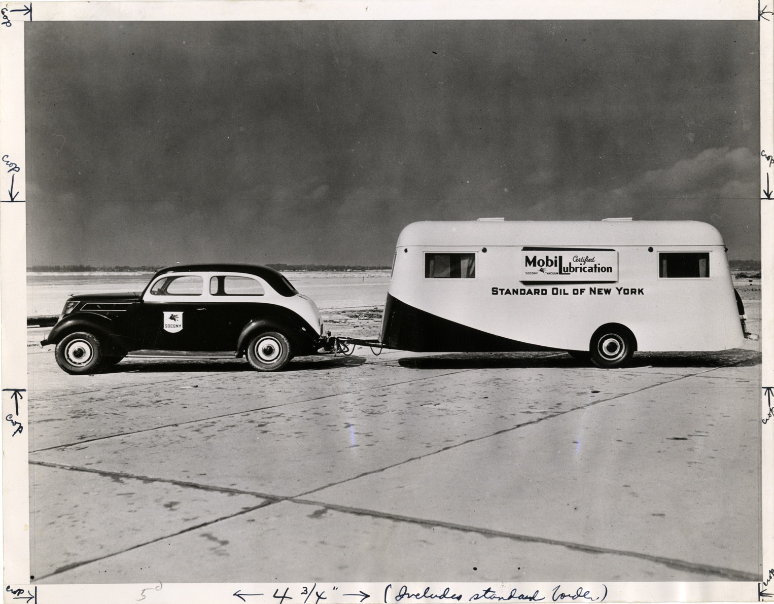 View of a car pulling a trailer for the Standard Oil Company of New York. "Socony" and logo painted on car; "Standard Oil of New York" and "Certified Mobil lubrication, Socony Vacuum" painted on side of trailer. Label on back: "Auto trailer equipped for sound movies. Equipped with talking motion pictures and designed to serve as a traveling laboratory, the auto trailer shown above will visit cities in western New York as part of an educational program sponsored by the Socony-Vacuum Oil Company to keep service station dealers and motorists in that section informed of the most modern methods of automobile lubrication. Courtesy Press Bureau, J. Stirling Getchell, Inc., Chrysler Building, New York." Handwritten on back: "Camping, 1937."